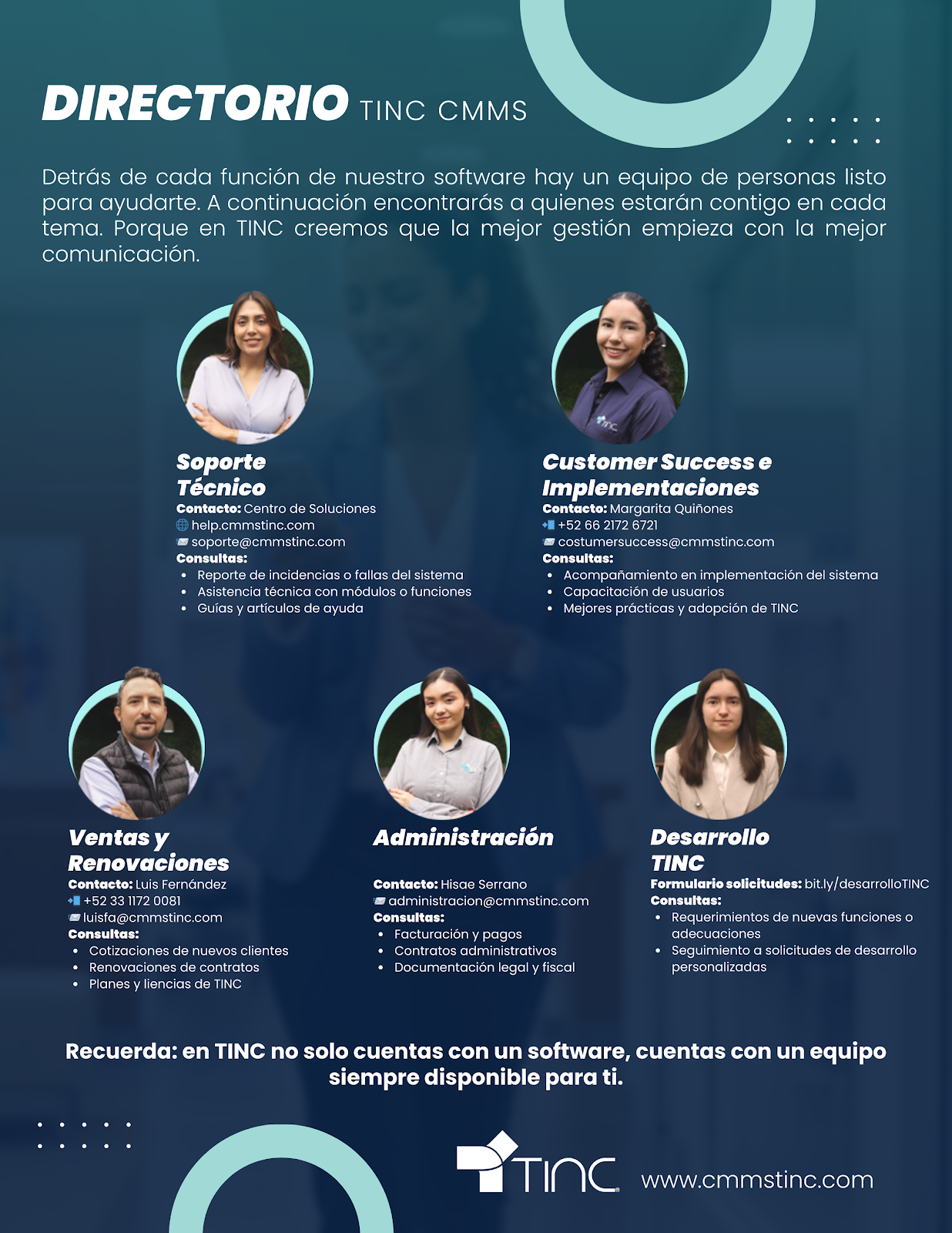 El Directorio TINC | Tu equipo de apoyo es una guía visual que te muestra a las personas encargadas de cada área dentro de TINC CMMS.