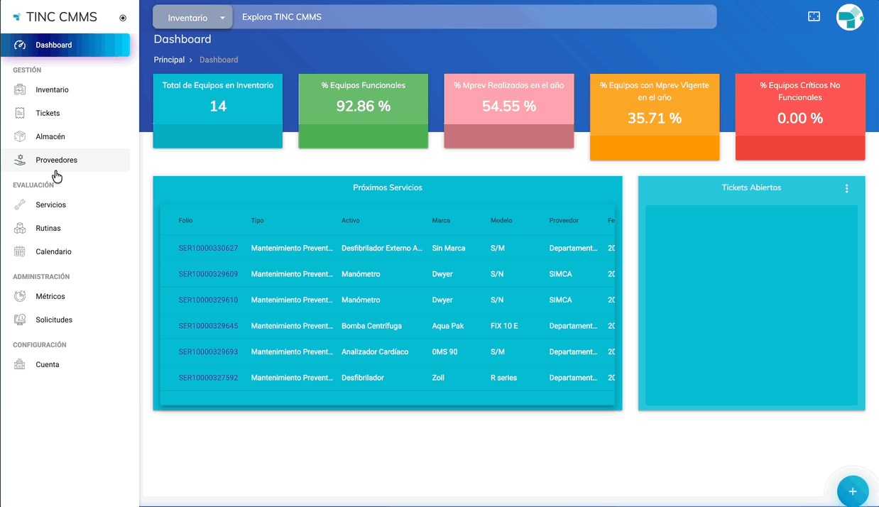 El módulo Proveedores en TINC CMMS IS te permite buscar proveedores registrados, consultar su información de contacto y conocer los servicios que ofrecen. Además, esta información es clave para indicar qué proveedor está realizando un servicio en órdenes de servicio, tickets, vendedor y dueño. Para consultar el catálogo de proveedores, el usuario debe contar con permisos de Administrador, Especialista de Servicio, Supervisor y Compras.