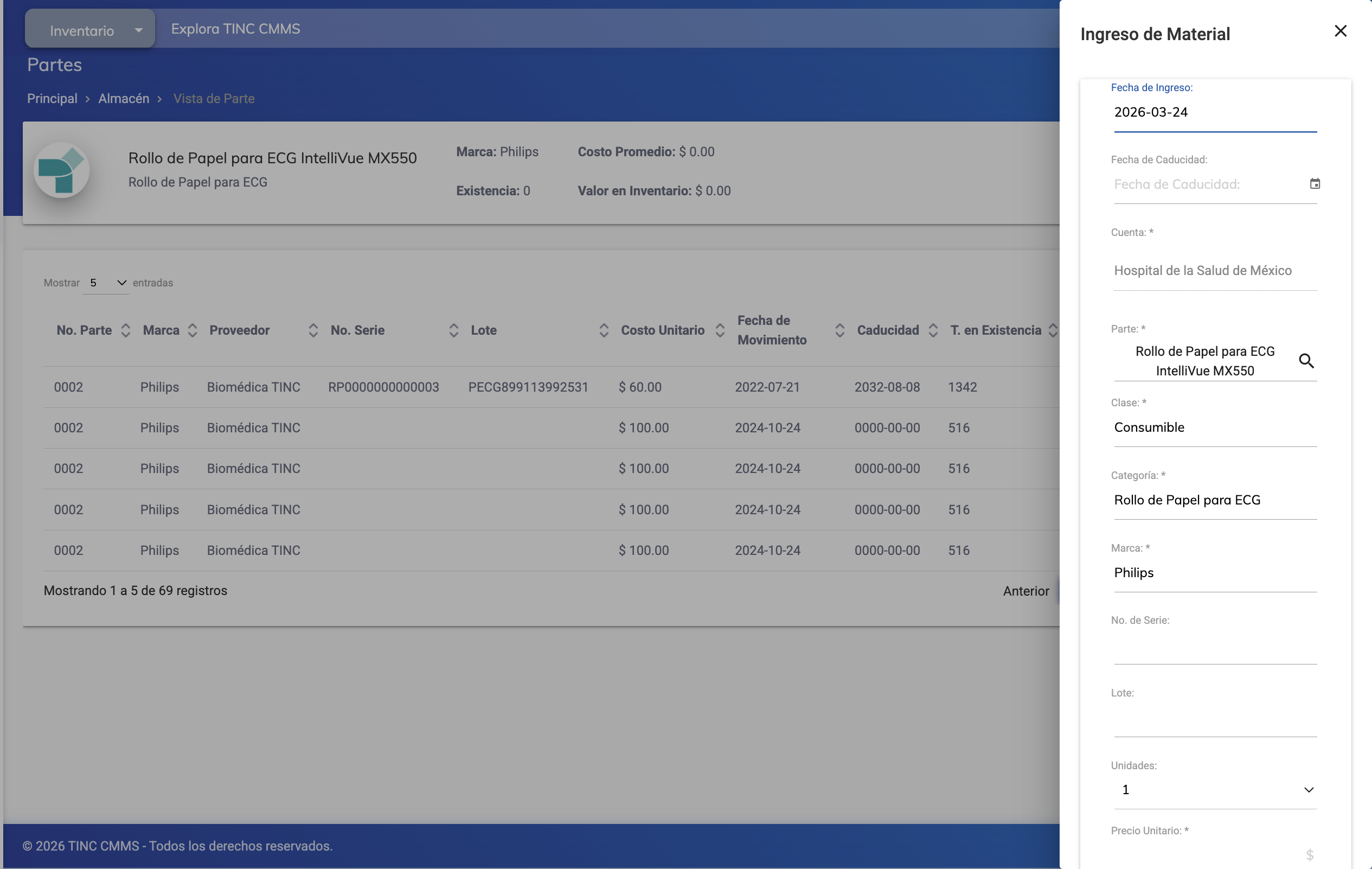 El módulo Almacén permite gestionar el registro, consulta y control de materiales, partes y categorías, facilitando la administración del inventario y el control de existencias dentro de TINC CMMS IS.
