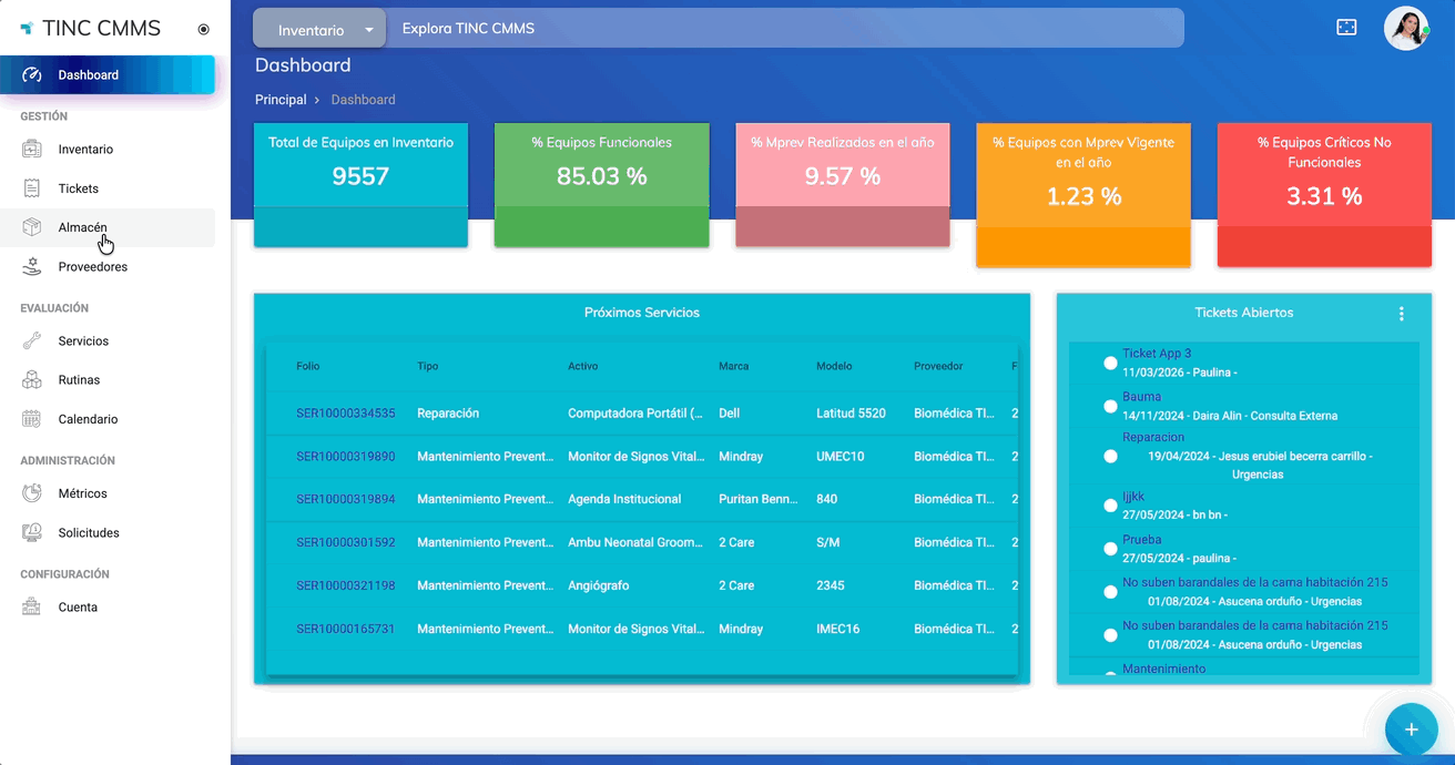 El módulo Almacén permite gestionar el registro, consulta y control de materiales, partes y categorías, facilitando la administración del inventario y el control de existencias dentro de TINC CMMS IS.