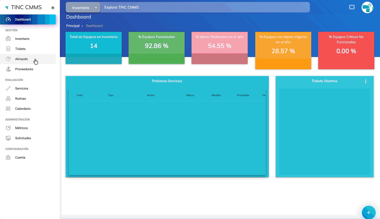 El módulo Almacén permite gestionar el registro, consulta y control de materiales, partes y categorías, facilitando la administración del inventario y el control de existencias dentro de TINC CMMS IS.