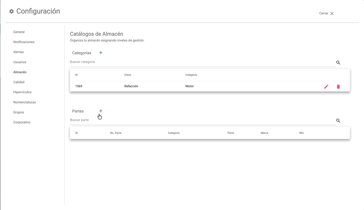 Paso 4. El sistema redirigirá automáticamente al módulo de Configuración, en el apartado de Almacén, donde podrás crear categorías y partes, siguiendo los pasos previamente descritos.