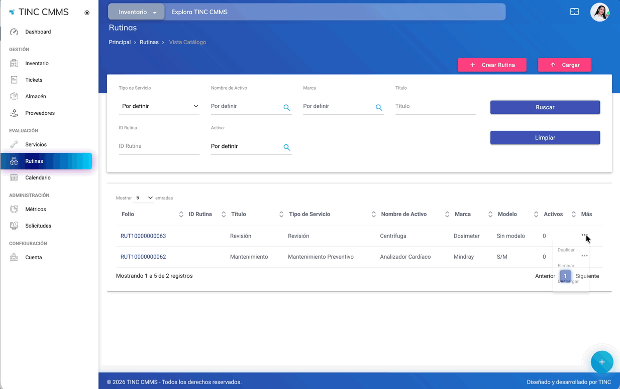 El módulo de Rutinas permite gestionar plantillas estandarizadas de mantenimiento o servicio. Además de crearlas, los usuarios pueden duplicar o eliminar rutinas según sea necesario para su operación.