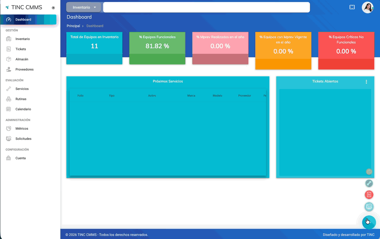 La creación de tickets permite registrar solicitudes relacionadas con mantenimiento, servicio técnico o incidentes en los activos. Este proceso es esencial para dar seguimiento, documentar y resolver reportes de forma estructurada.